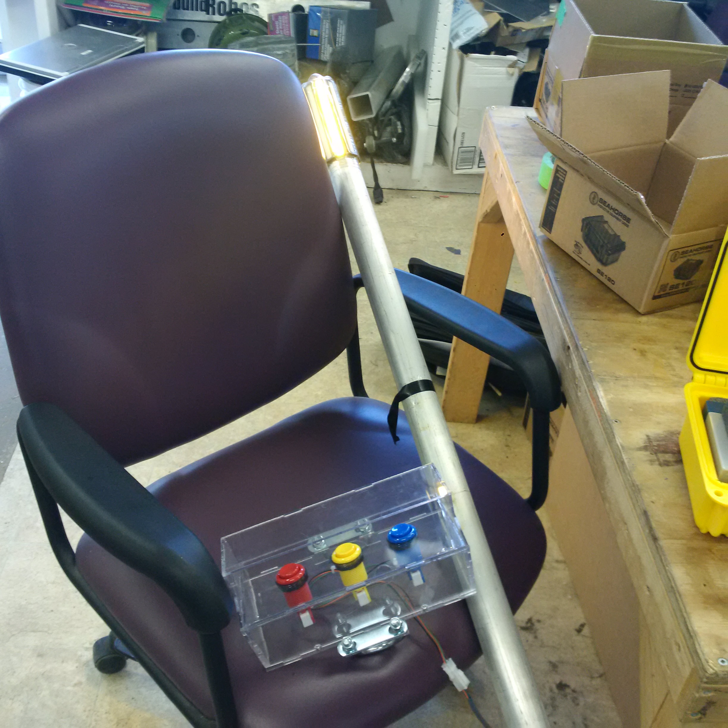 The system I ended up building consists of a Parallax Propeller based circuit board in a Seahorse case with an SLA battery for power. The light pole uses LED strips intended for ground effect lighting and the buttons are standard arcade machine buttons. Communications are provided by XBee S3B-DM modules, which are probably way overkill for the application, but I decided to start at the top rather than have to work my way up until I found what worked. The base station communications is provided by a stock Digi XBee development board connected to the computer by a USB cable.