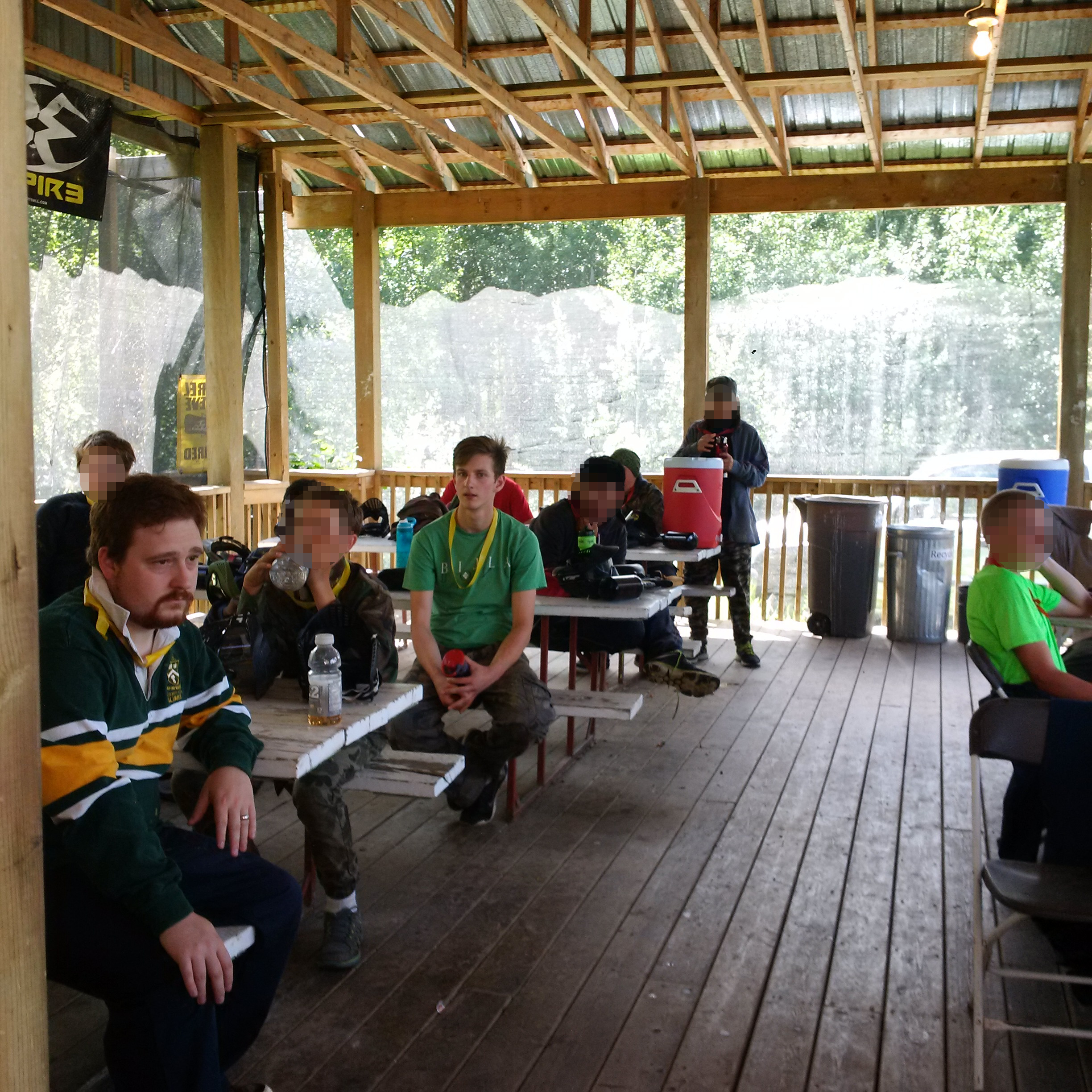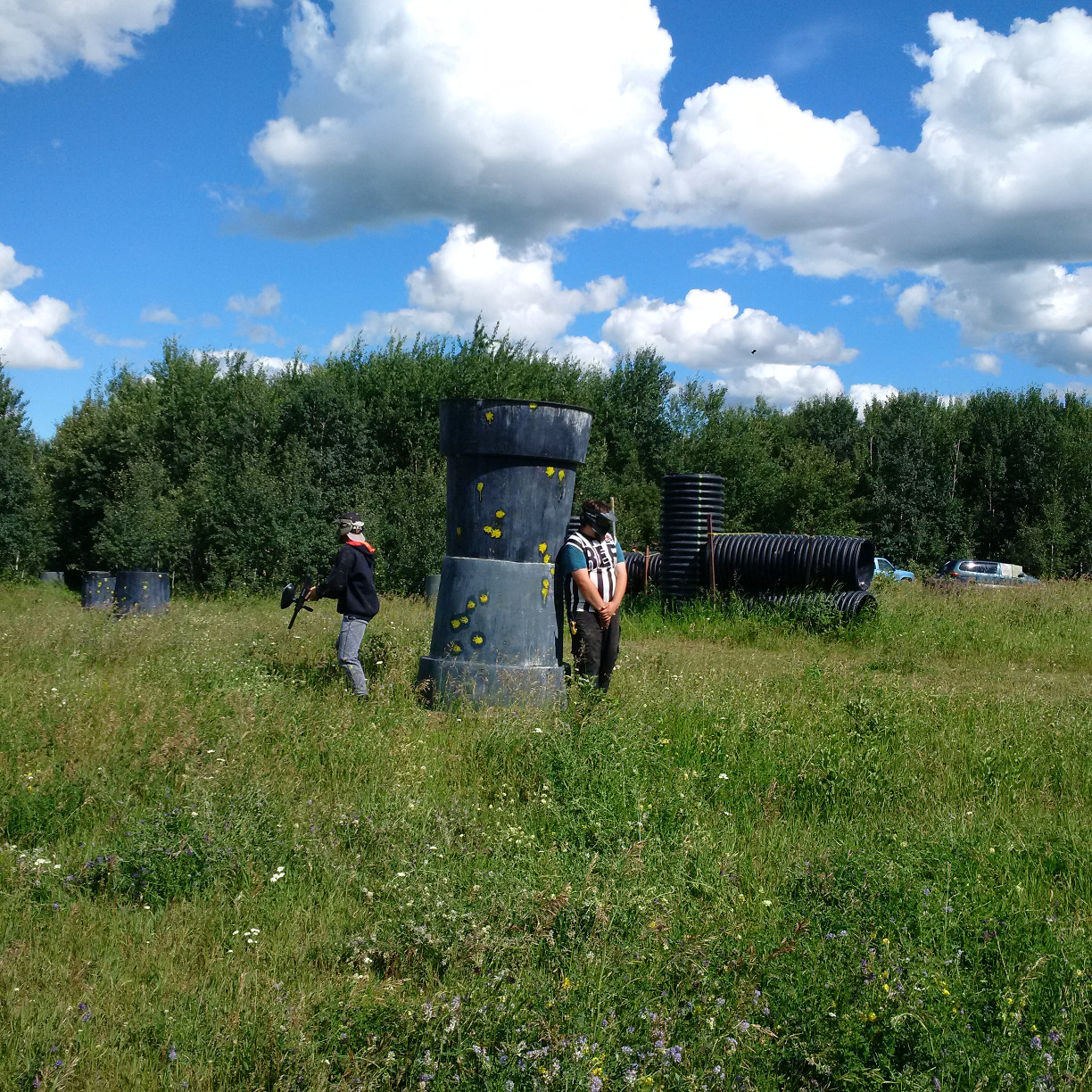 I watched the first couple of games from inside the safe zone. One of the staff provided the players with game progress updates over the PA system. Finally, on the third game, I decided to venture out and watch the action first hand. Sadly, after one picture, my phone announced to me that my memory card was full… and I didn’t feel in a particularly safe situation to go through my pictures and delete old ones. So this is the only photo I got while paintballs were whizzing around me. Yes the ref is protecting his junk. He was caught in the crossfire between a couple players. Yes, he did get hit.