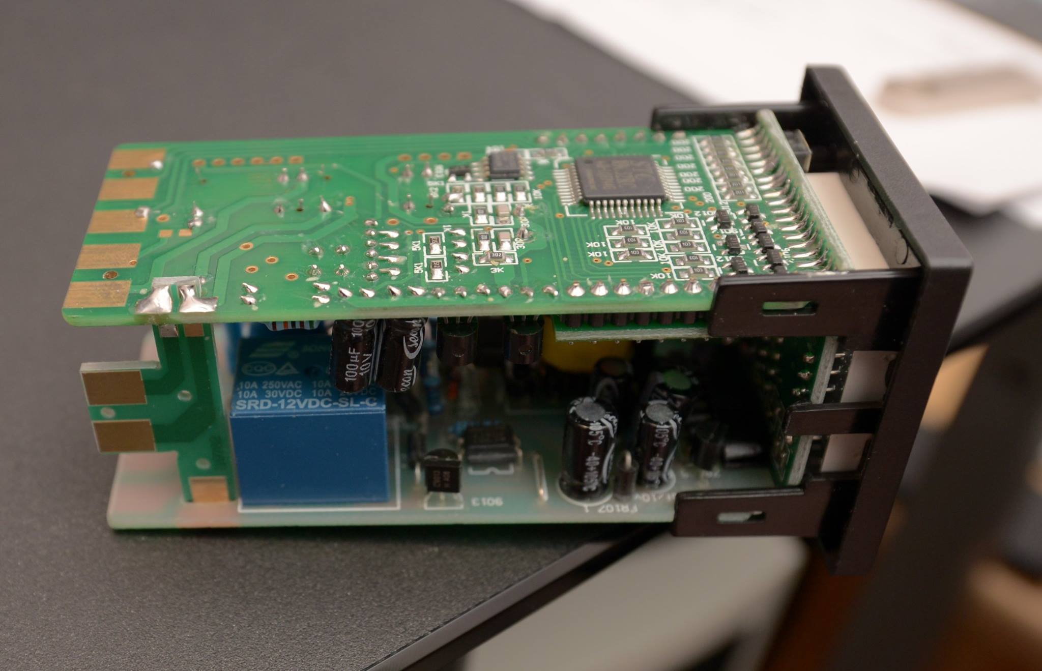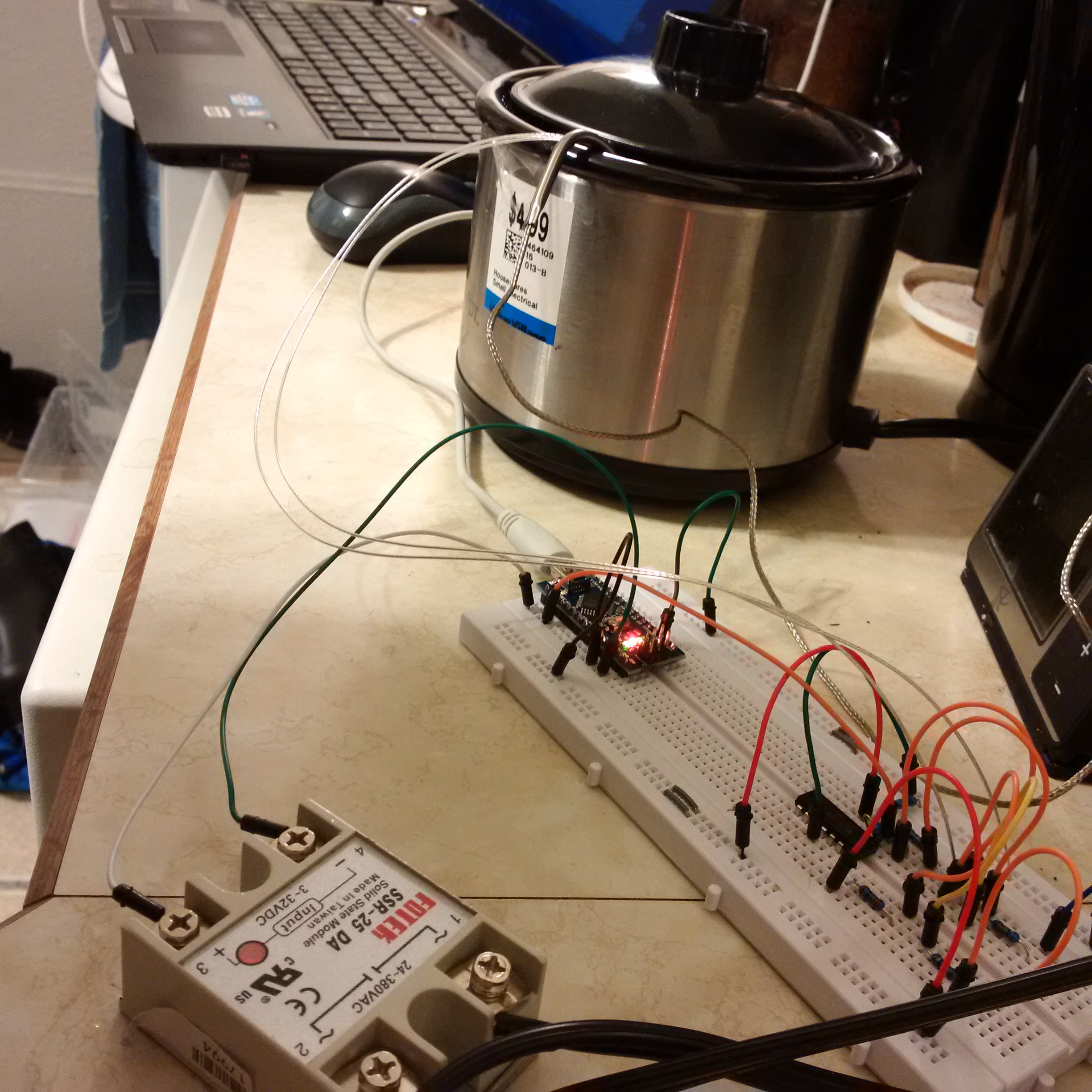There are 101 ways you could do this. I’m going for cheap. My temperature sensor is a super-cheap PT100 PTC sensor. I am running it in a wheatstone bridge connected to a differential amplifier tuned to get the best resolution out of the temperature range I’m interested in. (49C – 74C) The output of that goes to a Nano clone, which currently only turns a Solid State Relay on and off. (I plan to use PID in the future) The relay turns a slow cooker on and off. This tiny one really isn’t hot enough, but I’m giving it a try today.